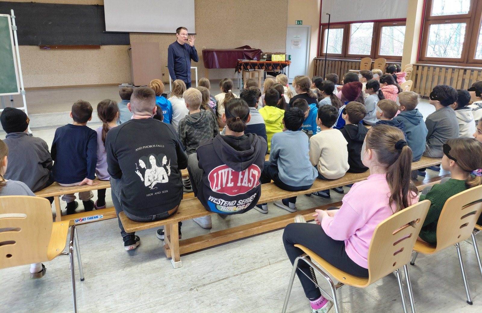 Regelmäßig treffen sich Kinder, Lehrkräfte und der Schulsozialarbeiter zur Schulversammlung.